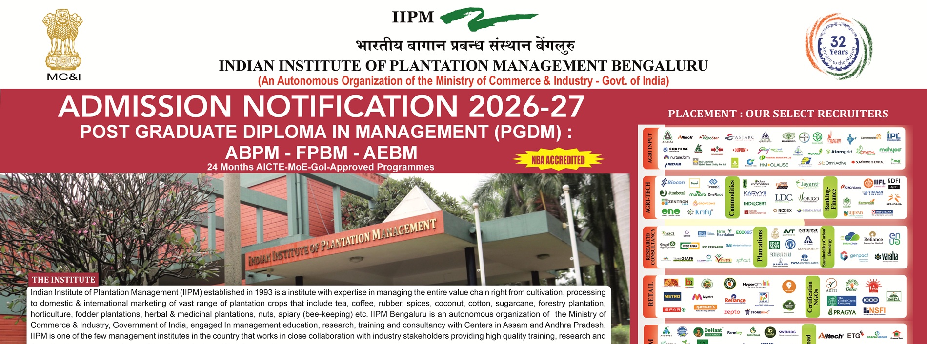 Indian Institute of Plantation Management Bangaluru (IIPMB) is an exclusive sectoral institute with the capability and expertise to contribute to the Agri, Plantation, Horticulture, and Allied sectors from various dimensions- education, export facilitation, capacity building and training, policy research, research and development, and others to meet the demand of the sector.