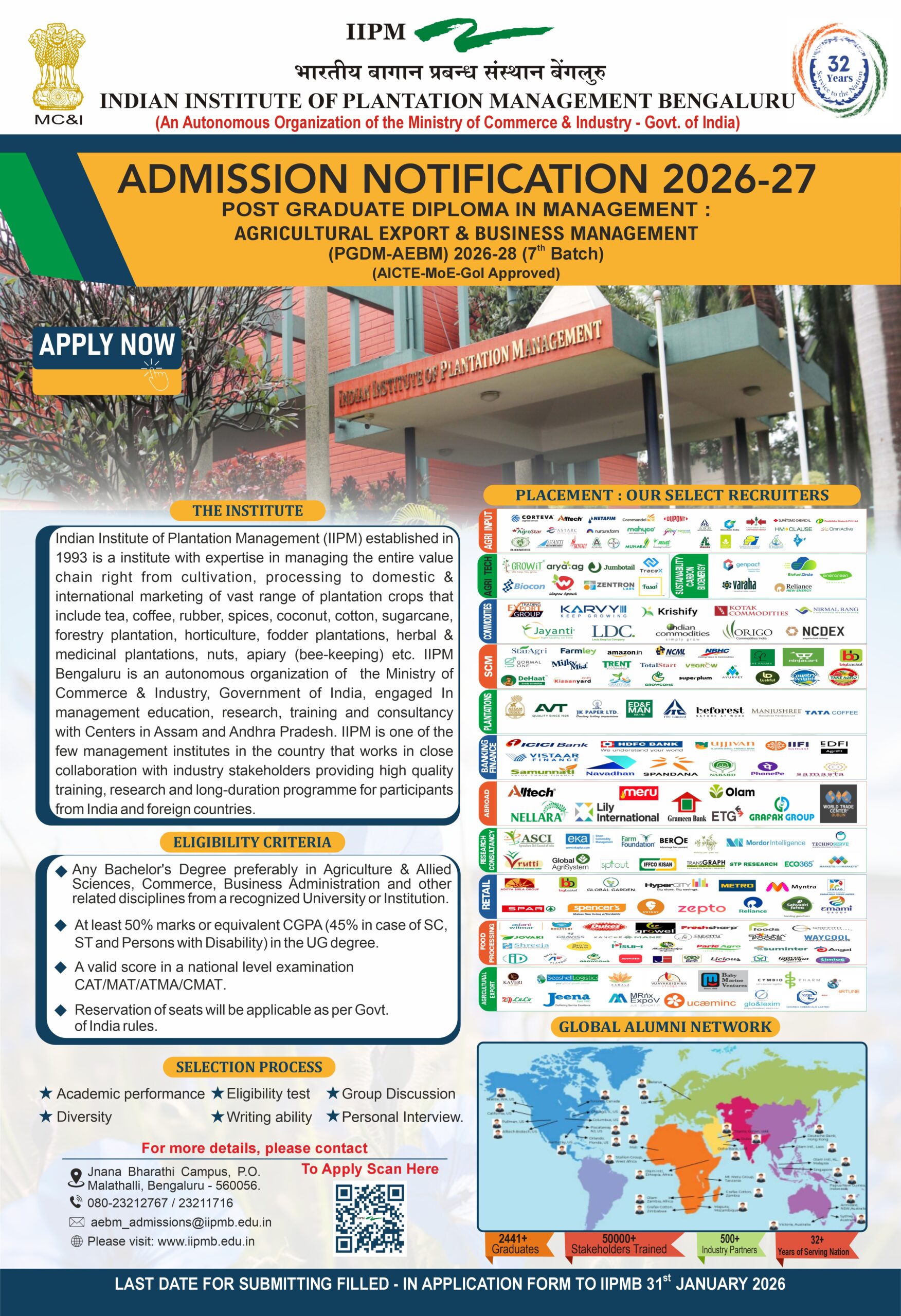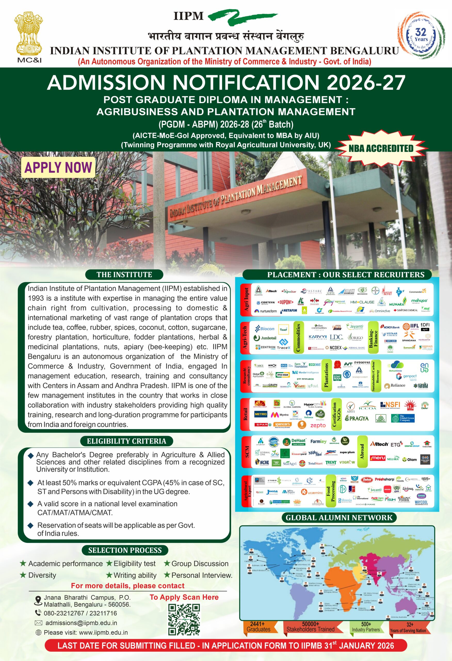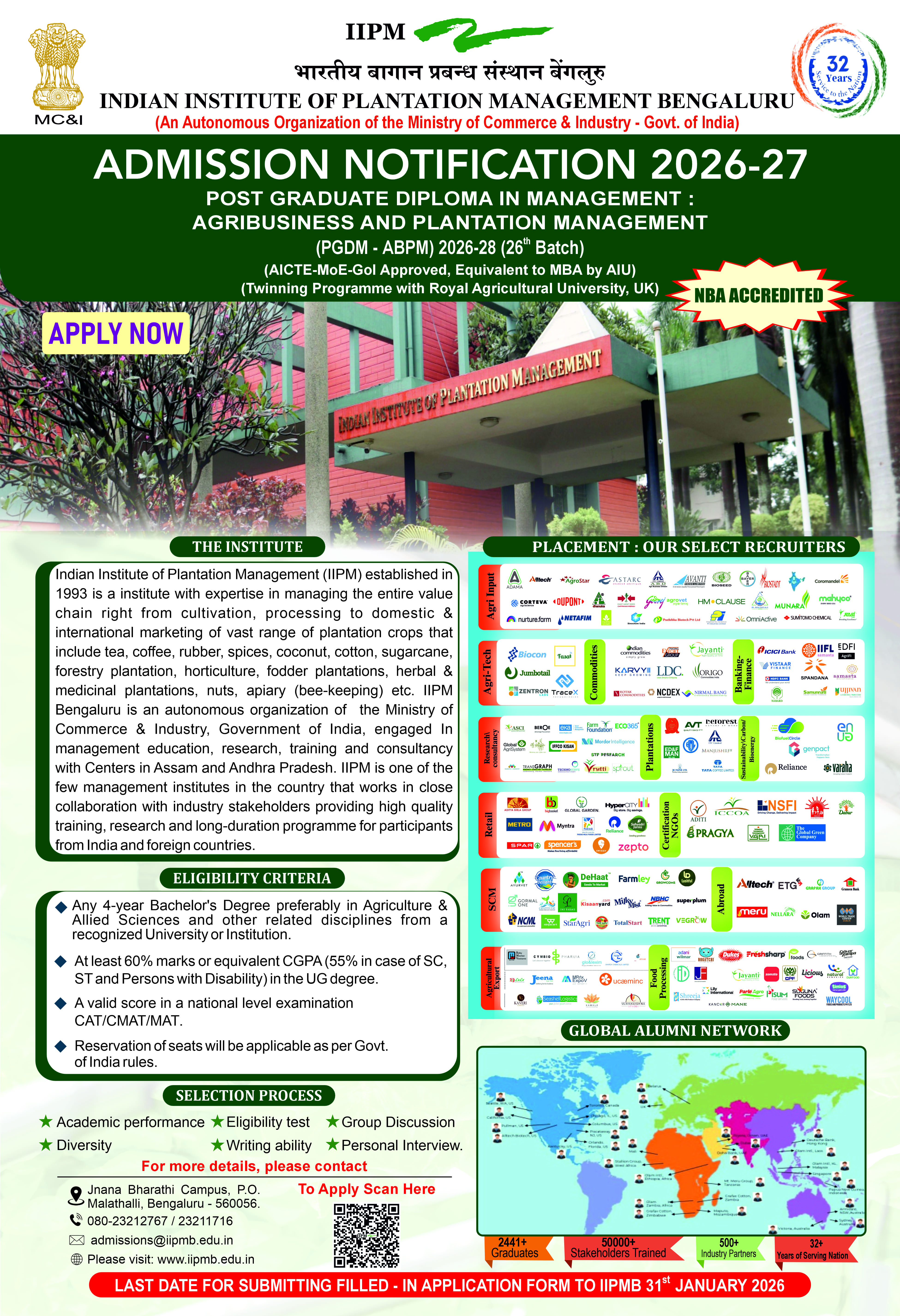Indian Institute of Plantation Management Bangaluru (IIPMB) is an exclusive sectoral institute with the capability and expertise to contribute to the Agri, Plantation, Horticulture, and Allied sectors from various dimensions- education, export facilitation, capacity building and training, policy research, research and development, and others to meet the demand of the sector.